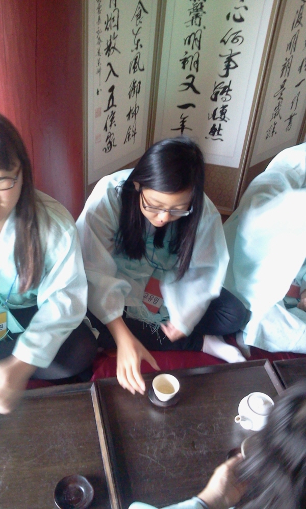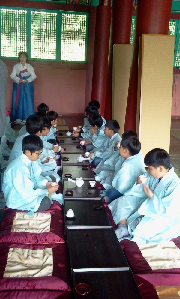 차 마시는 방법과 차의 종류를 배우고 한잔씩 따라 마셨어요. "차 맛이 참 좋습니다."하는 인사법도 배웠지요.